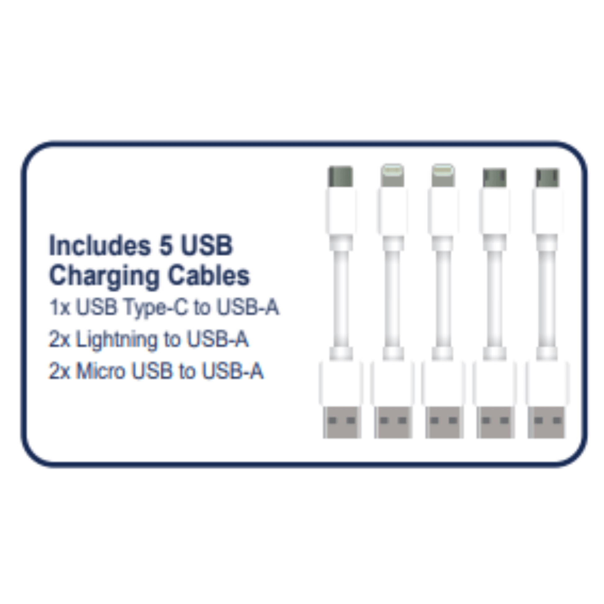 - Included in the box are 5x 6inch USB charging cables - 1x USB Type-C to USB-A, 2x Lightning to USB-A, 2x Micro USB to USB-A