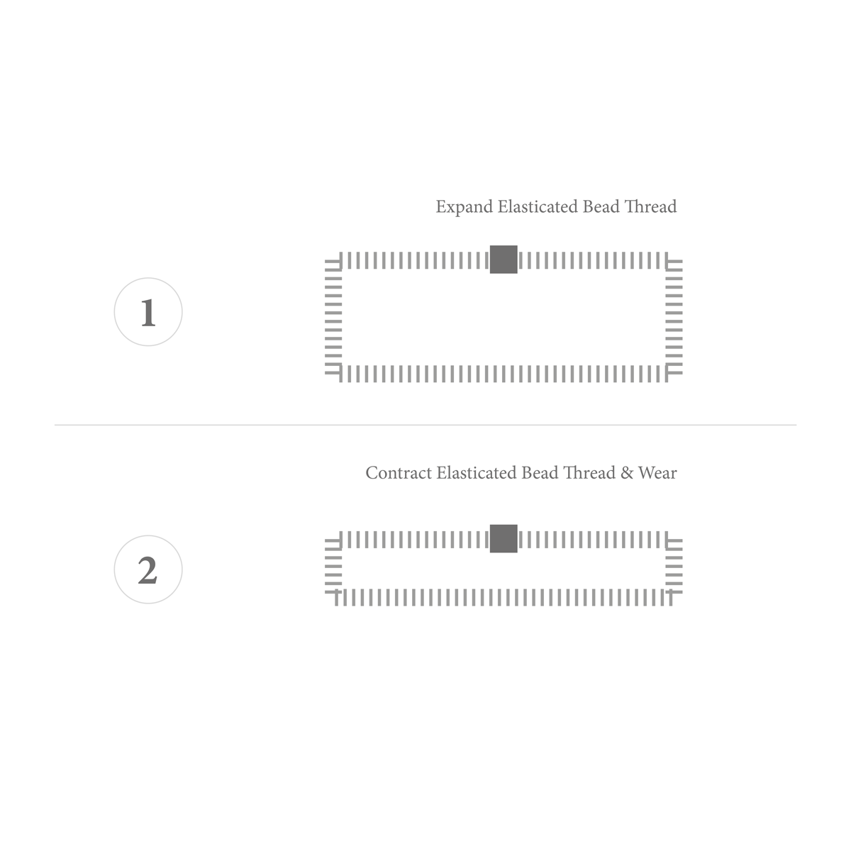 This bracelet is available in four bracelet lengths, 17cm, 19cm, 21cm or 23cm in circumference, with the elastic nylon thread able to expand to fit onto your wrist. To take the bracelet on or off your wrist, simply slide the bracelet over your hand. Less is More.